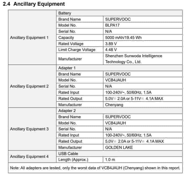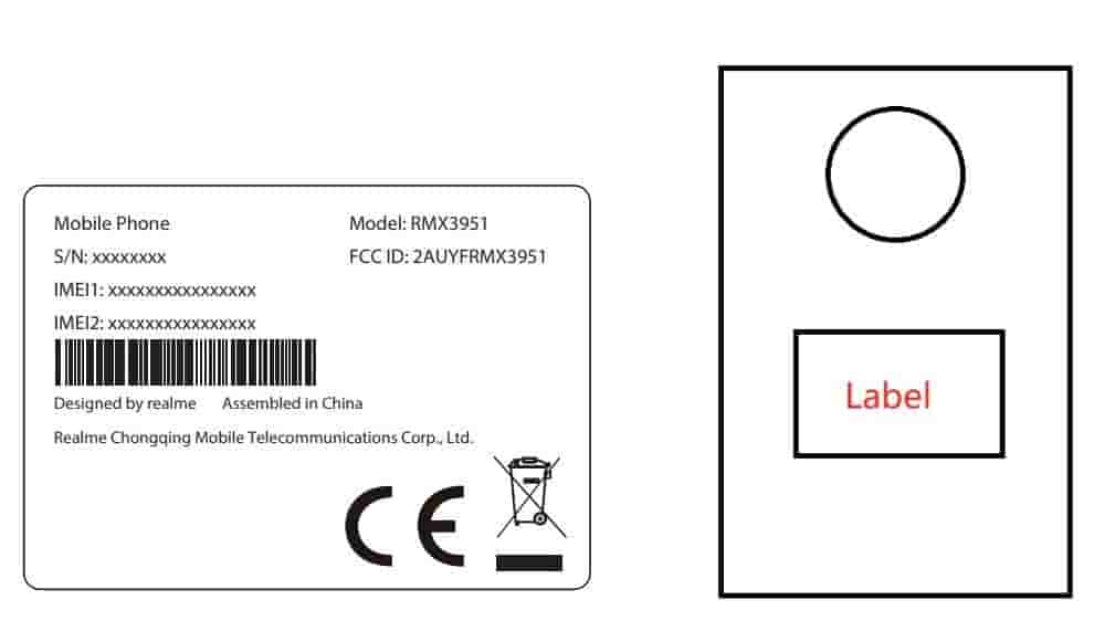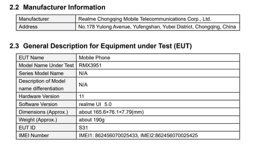 The device was spotted with FCC ID- 2AUYFRMX3951. The label positioning is also shown in the above image. The FCC listing confirms that the device will sport a 5000mAh battery (typical capacity) and will be accompanied by a VCB4JAUH SuperVOOC charger. The charger with this model number supports 45W fast charging. It will run on Realme UI 5.0. The device will measure 165.6×76.1×7.79mm and weigh about 190g.