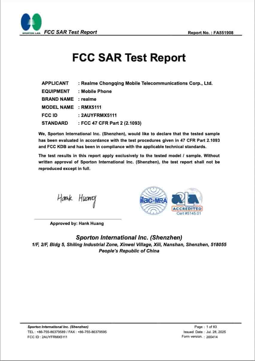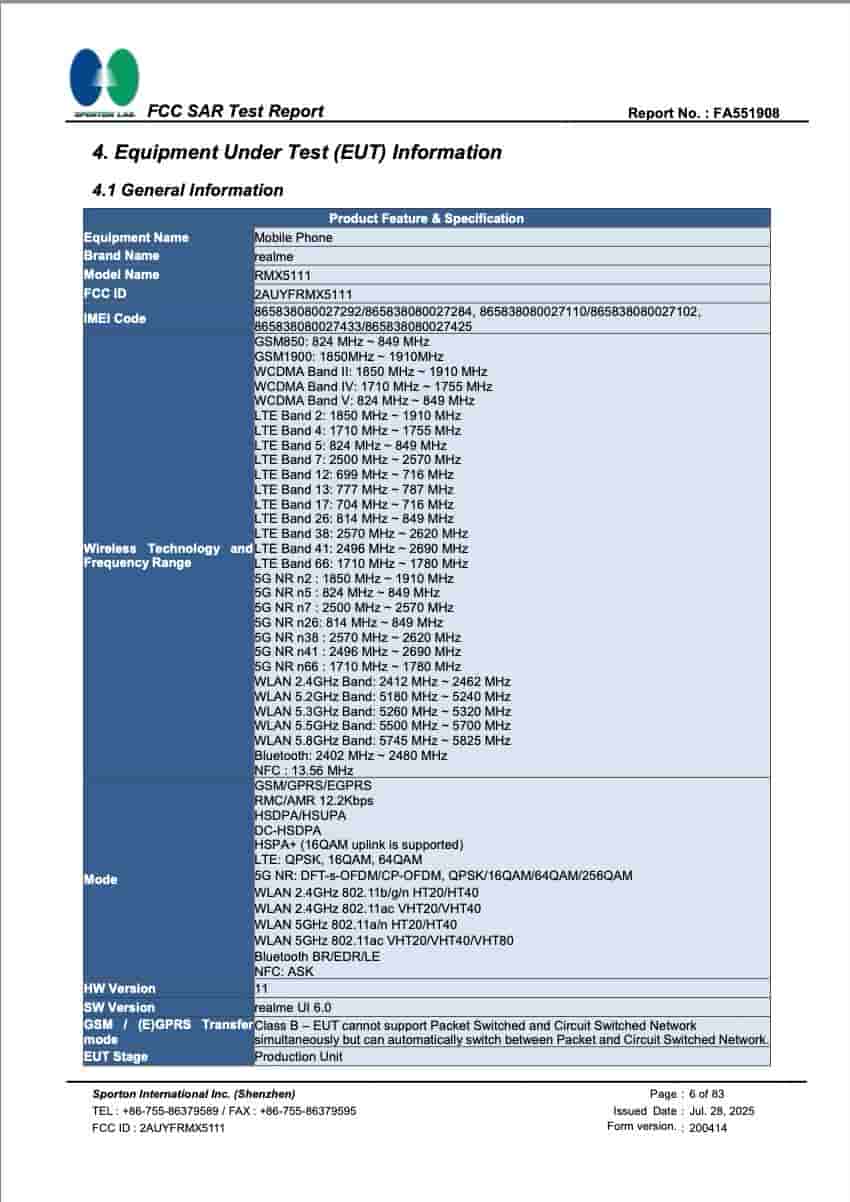 Realme 15T 5G Appears on the FCC, NBTC, and Geekbench Databases: Dimensity 6400, Realme UI 6.0, Dual-Band WiFi, NFC, and More Revealed