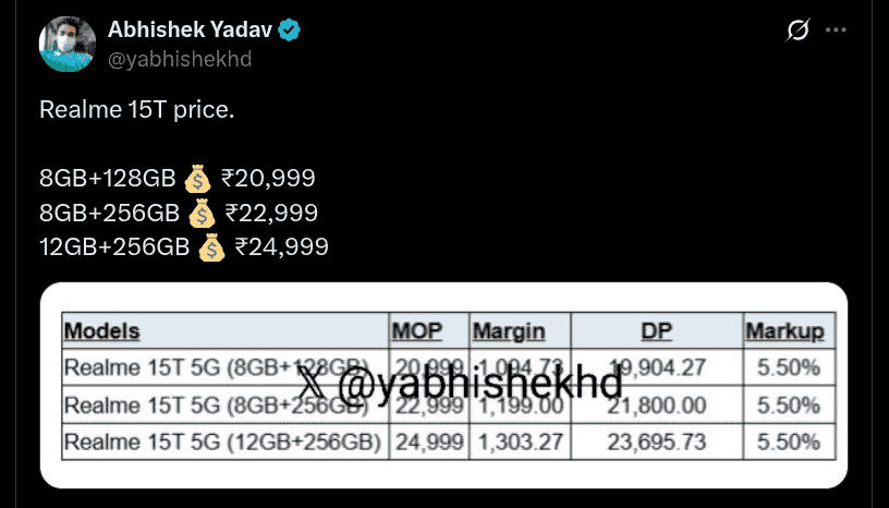 Realme’s next 15 series smartphone model – the Realme 15T 5G has already been spotted on multiple databases and its launch is expected to take place soon. Now, the details concerning its key specs, design, color choices, storage options, and pricing have been leaked online.