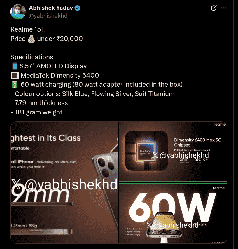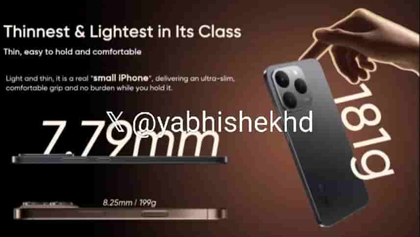 As per the new updates (received via @yabhishekhd on X), the upcoming Realme 15T 5G is revealed to hit the market as the ‘thinnest and lightest in its class’ and it is claimed to be a ‘small iPhone’ that delivers an ultra-slim and comfortable grip. In terms of its thickness and weight, the device is pointed out to feature a thickness of 7.79 mm and it is said to weigh only 181 gm.
