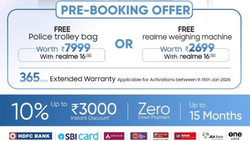 From the poster, it is revealed that customers who pre-book the device can either receive a Police trolley bag worth ₹7,999 or a Realme weighing machine worth ₹2,699. Just below this, the poster mentions that a 365-day extended warranty will be offered to users who activate the device between the 9th and the 15th of January 2026, which could be a typo since the device is going to launch on April 2nd. At the bottom of the poster, it mentions buyers who pre-book can get up to ₹3,000 instant discount, zero down payment options, and up to 15 months of EMI plans through multiple banking partners such as HDFC Bank, SBI, Axis Bank, AU Small Finance Bank, IDFC First Bank, Kotak, J&K Bank, and OneCard.