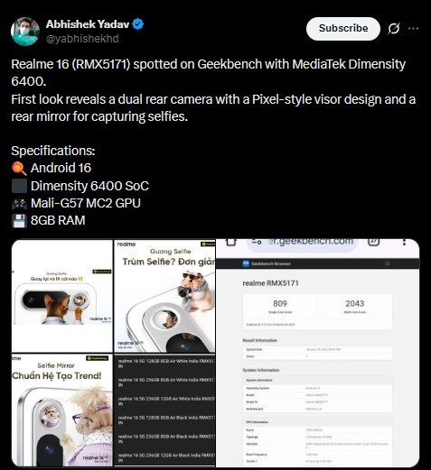 Realme 16 5G’s Prototype Spotted on Geekbench With MediaTek Dimensity 6400 SoC, Android 16 and 8GB RAM