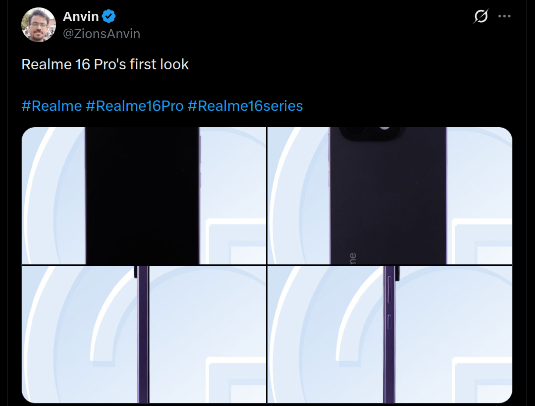This update comes from the tipster @ZionsAnvin and via the revealed first look images, the Realme 16 Pro smartphone is pointed out to feature an overall flat form factor with rounded corners. Its display screen appears flat, and there is a centrally-placed punch-hole selfie camera at the top. The real panel is also flat and it seems to have a Black matte finish. Towards the top-left portion, a projected even Blacker-colored camera module is given, housing an inner pill-shaped unit, a separate inner circular unit, and an LED flashlight. At the bottom-left portion of the rear, the Realme branding has also been marked in a vertical manner. Coming to the sides, it has a Purple color tone. On the right side panel, the volume rockers and power button can be spotted, while the left side panel remains vacant.