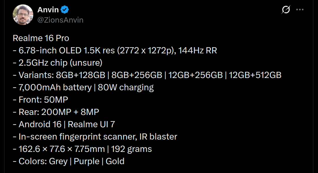 In related news, previously Realme’s 16 Pro smartphone was reported to have made its appearance on the TENAA database, and its battery and few connectivity specs were confirmed. Additionally, the above mentioned storage options and color choices are also said to be made available for Indian customers as well.