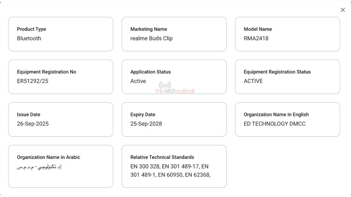 Realme’s Buds Clip earbuds with the model number of ‘RMA2418’ has received the TDRA certification with the equipment registration number of ‘ER51292/25’, and this device has been categorized as a ‘Bluetooth’ product. Notably, its moniker has been listed on the certification database, and its TDRA certification validity will be till the 25th of September 2028. Also, the TDRA certification has confirmed its UAE launch.