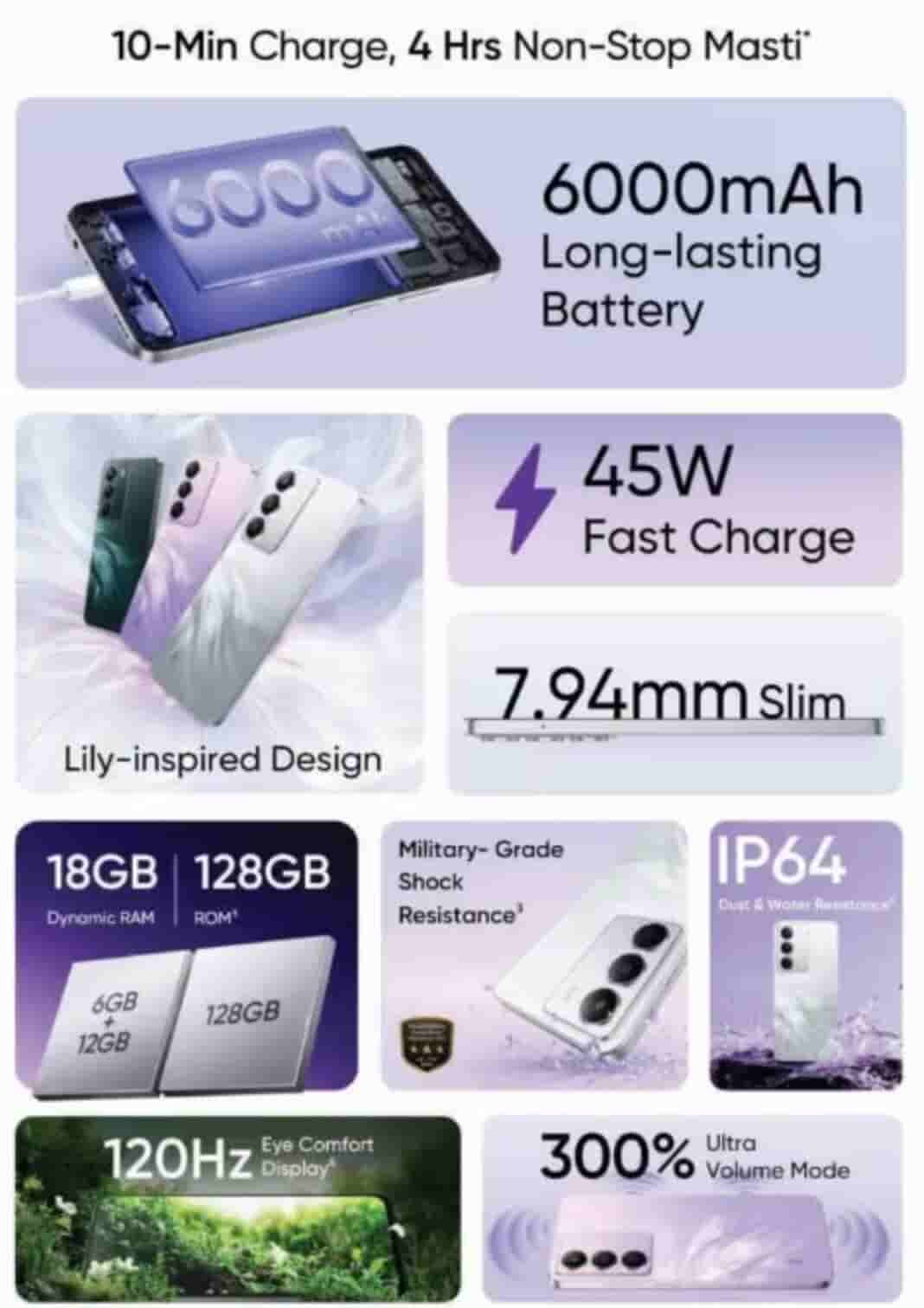 The key specs of this upcoming device are also revealed (via promotional image). It is revealed to offer 120Hz refresh rate and come with Eye comfort mode. The device will be backed by 6000mAh battery and support 45W fast wired charging. It will offer 4 hours of non-stop use with 10 minutes of charging. It will come in 4/6GB RAM and 128GB internal storage while there will also be 12GB Dynamic RAM. It is said to arrive with 7.99mm slim body and feature Lily-Inspired design.