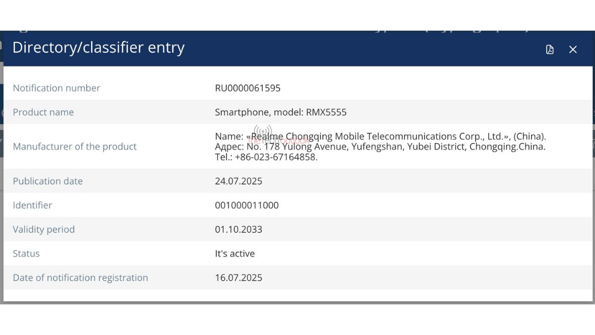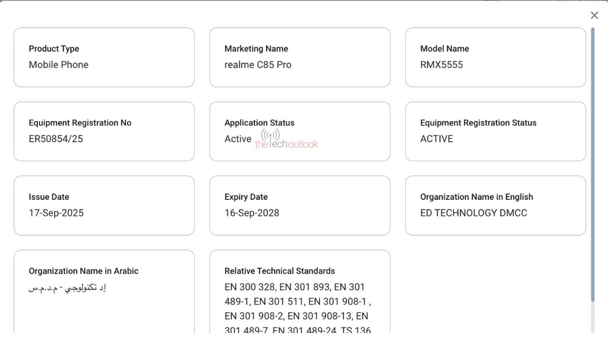 Realme’s C85 Pro smartphone with the model number of ‘RMX5555’ has received the TDRA, EEC, and TUV SUD certifications. On the TDRA certification database, this upcoming device has been certified with the equipment registration number of ‘ER50854/25’ and it is categorized under the ‘Mobile Phone’ section. The moniker of the upcoming device has also been listed on the TDRA database, and its certification will only be valid until the 16th of September 2028. Coming to its EEC listing, it has received the EEC certification with the notification number of ‘RU0000061595’, with a certification validity until the 1st of October 2033. To note, the TDRA and EEC listings confirm the device’s launch in the UAE and European markets as well.