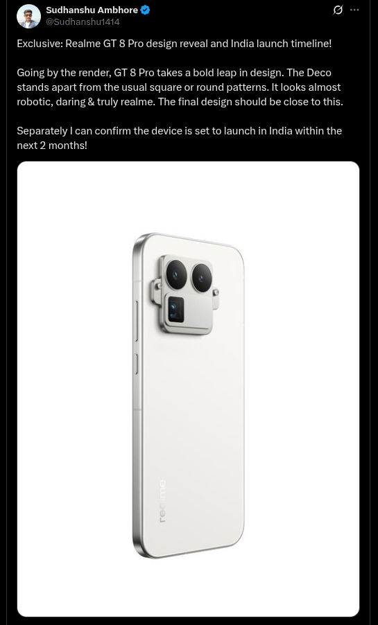 This update comes from the X tipster @Sudhanshu1414 and along with the Realme GT 8 Pro design render that was revealed just recently, he has pointed out its possible launch time frame in India as well. As per what the tipster claims, its India launch is set to take place in the next two months, that is by the end of November 2025. Also, while the Realme GT 8 series is expected to introduce both the Realme GT 8 and Realme GT 8 Pro smartphones, the tipster’s post suggests that Indian customers may only be getting the pro model.