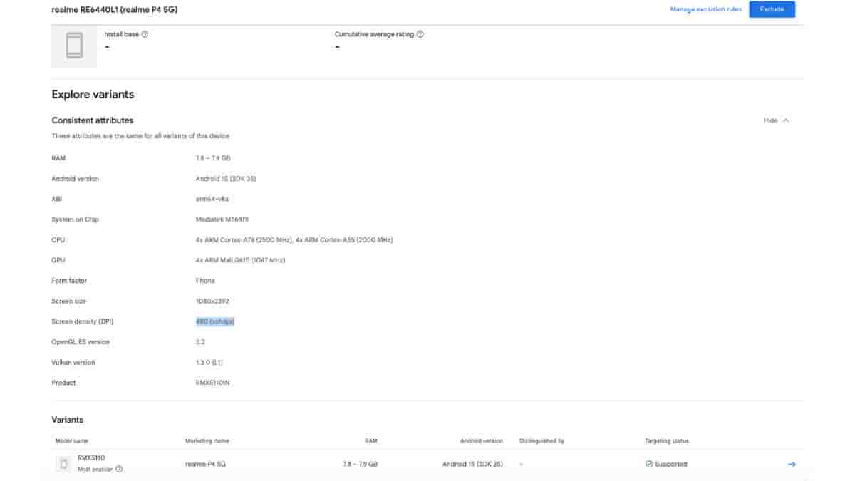 The listing further reveals that the Realme P4 5G will ship with Android 15 out of the box, offer 8GB RAM, a display resolution of 1080×2392 pixels, and a screen density of 480 dpi (xxhdpi).