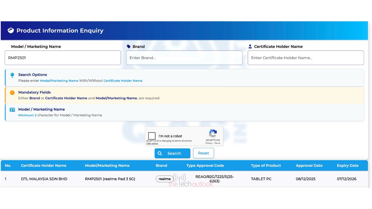 Coming to its SIRIM listing, Realme’s Pad 3 5G tablet (RMP2501) has received the certification with the type approval code of ‘REAO/82G/1225/S(25-6263)’. It has been listed as a ‘Tablet PC’, and its moniker has also been mentioned on the SIRIM certification database. To note, the certification validity is revealed to be till the 7th of December 2026. Also, the SIRIM certification listing confirms its launch in the Malaysian market.