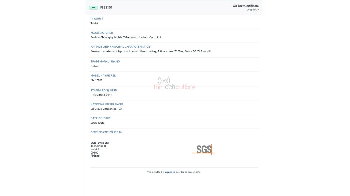 On the SGS certification platform, the Realme Pad 3 tablet 5G variant which carries the model number of ‘RMP2501’ has been certified with the certificate number of ‘FI-66301’, and the device has been categorized as a ‘Tablet’. Speaking more, a maximum operable altitude of 2,000 meters, 35° C operating temperature, and class III protection have also been revealed for the device. To add, the country codes like ‘EU’ and ‘SA’ point to the possible launch in the European (particularly in Finland) and Saudi Arabian markets. [The WiFi-only variant (RMP2502) was previously certified by the SGS authority.]