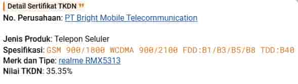 Finally, about its TKDN certification, it is noted to have a TKDN value of 35.35%. Moreover, via its TKDN certification, this Realme smartphone is pointed out to support 2G/3G/4G network, and it will also be hitting the Indonesian market too.
