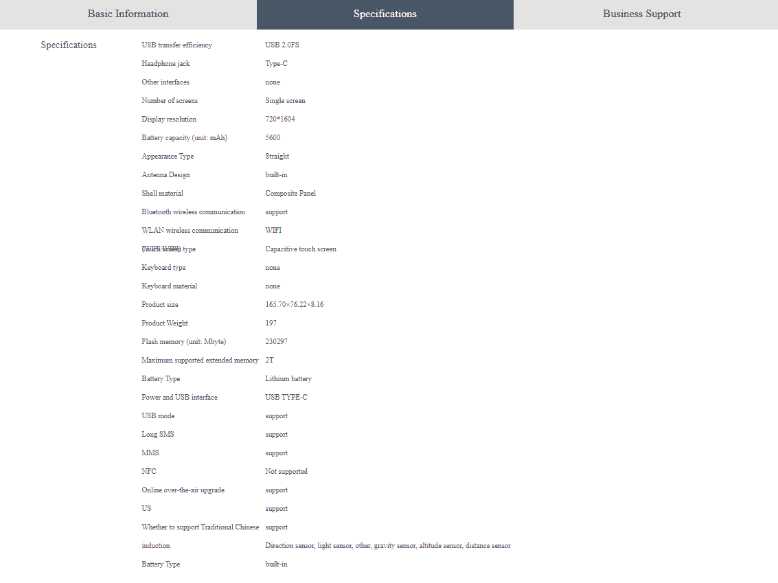 The device measures 165.70×76.22×8.16mm and weighs 197 grams. It features a 6.67-inch HD+ display with a resolution of 1604×720. The battery capacity is rated at 5600mAh. Regarding connectivity, the device supports dual SIM functionality and USB Type-C, though NFC is not included. The sensor array includes direction, light, gravity, altitude, and distance sensors.