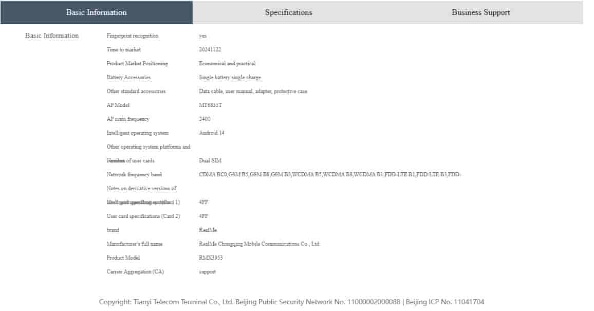 According to the listing, the device will be powered by the MT6835T chipset, which is the Dimensity 6300 SoC. It will run Android 14 out of the box, though the specific version of Realme UI 5 remains unspecified. The device will be available with 12GB RAM and up to 512GB of UFS 2.0 internal storage, expandable to 2TB via microSD card. The camera configuration includes an 8MP front sensor and a 50MP rear sensor.