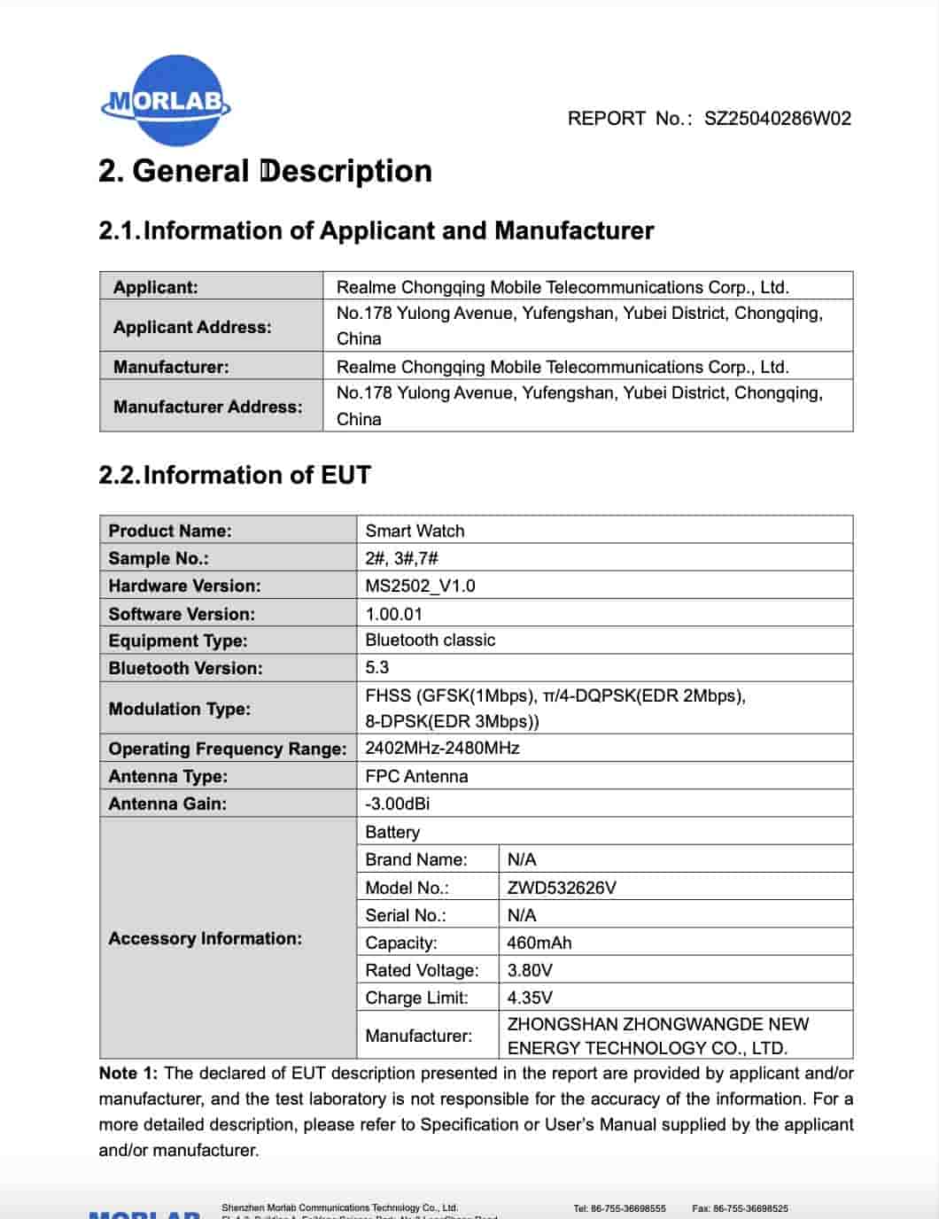 It is revealed that the smartwatch will support Bluetooth 5.3 and a 2402MHz-2480MHz operating frequency range. It features an FPC antenna, a battery with model number ZWD532626V that arrives with 460mAh capacity.