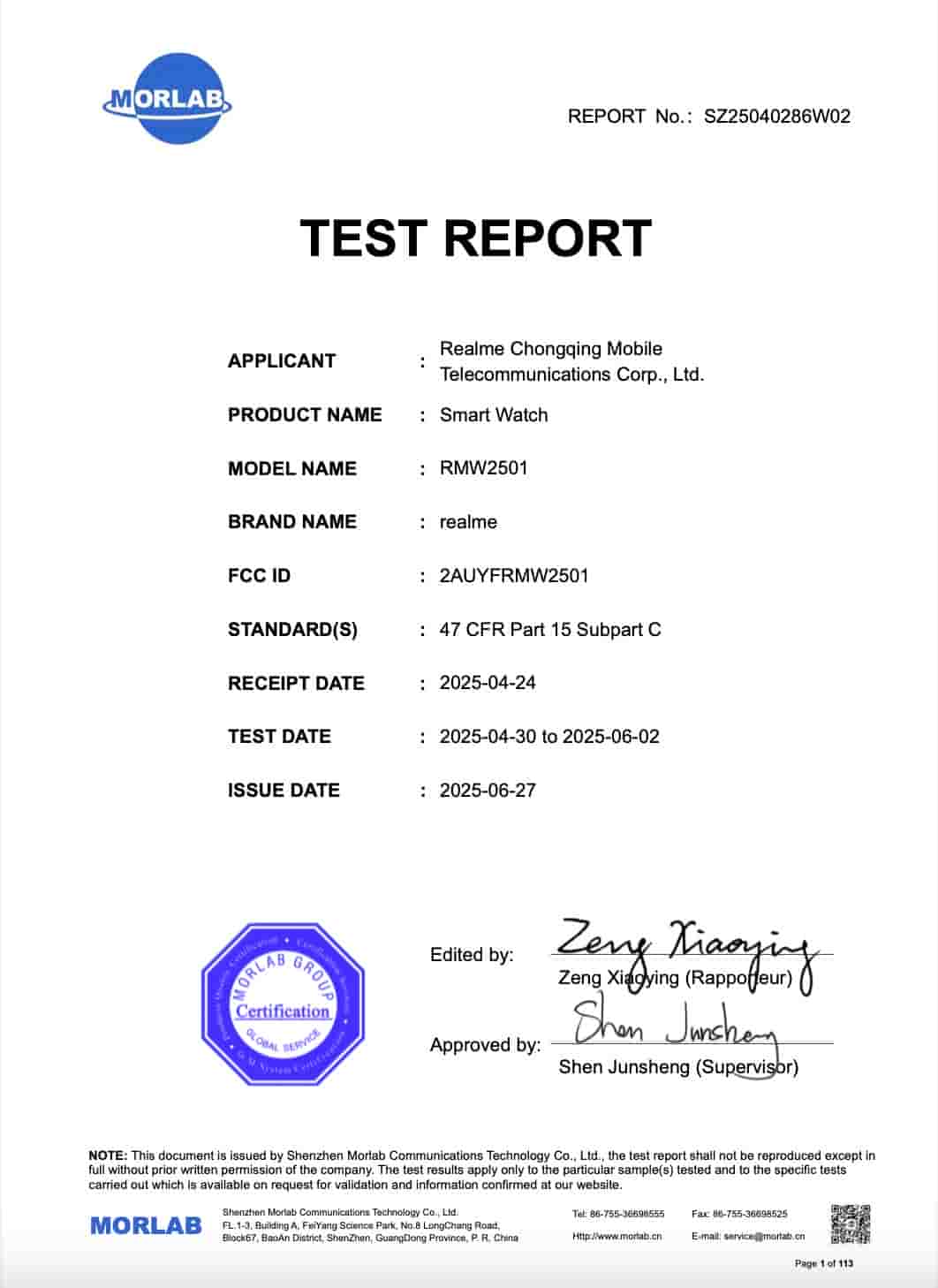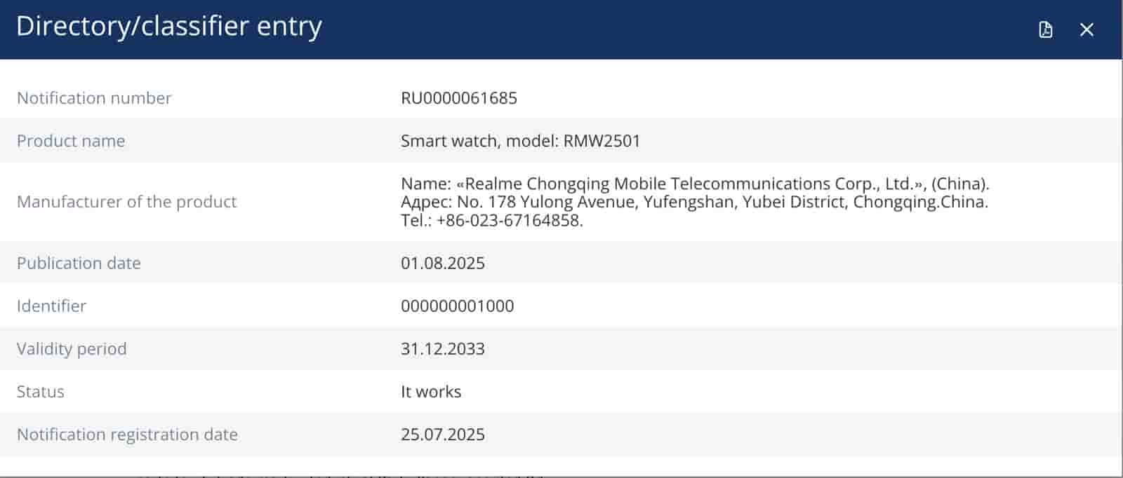 The smartwatch made its appearance with model number RMW2501. The EEC certification is valid till 31st December, 2033. On the FCC database, it was spotted with FCC ID 2AUYFRMW2501.