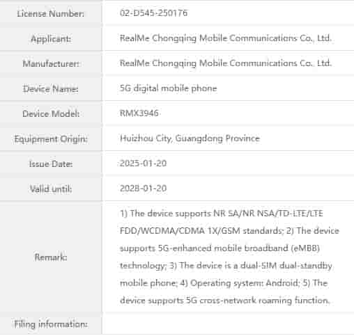 The two MIIT listed Realme smartphones carry the model numbers of ‘RMX3948’ and ‘RMX3946′ and have been certified with the license numbers – ’02-D545-250188′ and ’02-D545-250176’, respectively. Both of them are 5G digital mobile phones and their MIIT certification will be valid till the 20th of January 2028.