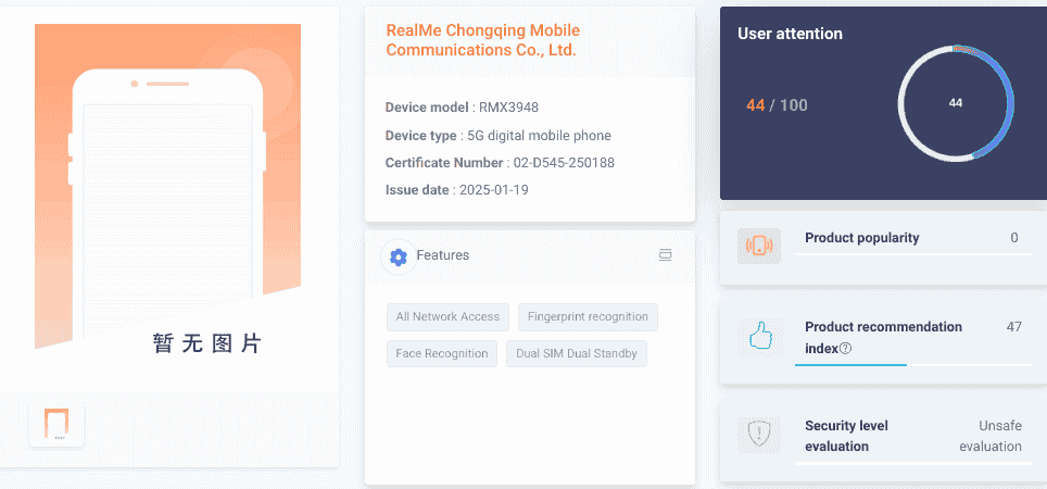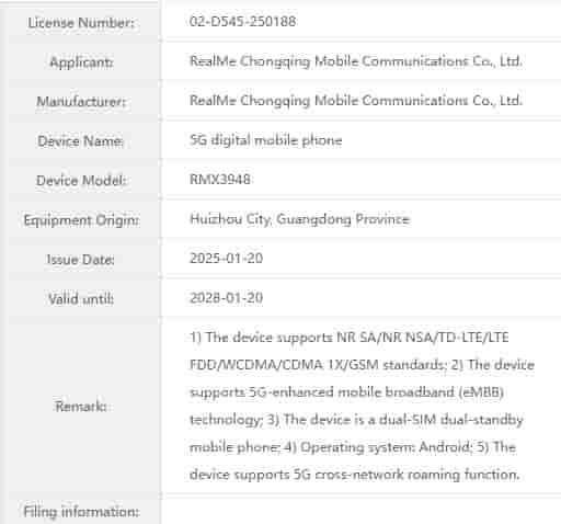 As pointed out above, the ‘RMX3948′ model has also received the TENAA certification with the certificate number of ’02-D545-250188’. A few key specs such as 2.4 GHz octa-core processor, Android OS, 4GB/6GB/8GB/12GB RAM, 128GB/256GB/512GB/1TB storage, microSD card support, 6.67″ IPS LCD display with 720 x 1604 pixels resolution and 16.7 million colors, 13MP main camera, 8MP selfie camera, 4880 mAh rated battery, fingerprint scanner (likely side-mounted), 165.7 x 76.22 x 9.94 mm dimension, and 190 gm weight are revealed