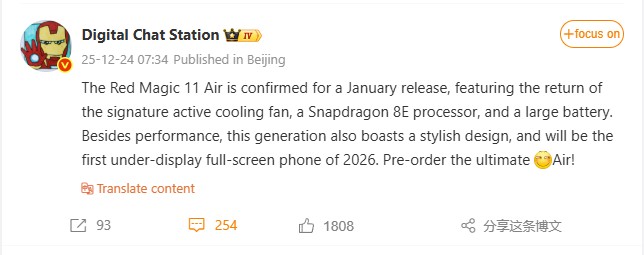 According to DCS, the RedMagic 11 Air will be powered by the Snapdragon 8 Elite chipset and feature a large-capacity battery, along with the brand’s signature active cooling fan. Notably, the tipster claims that it will be the first smartphone of 2026 to offer an under-display selfie camera.