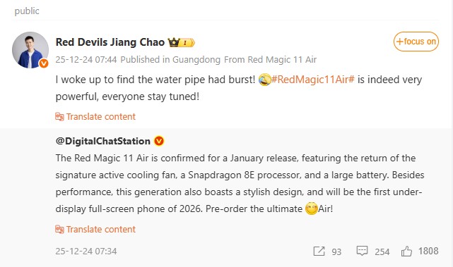These claims were further confirmed by RedMagic General Manager Jiang Chao, who responded to the leak with “I woke up to find the water pipe had burst! #RedMagic11Air# is indeed very powerful, everyone stay tuned!”.