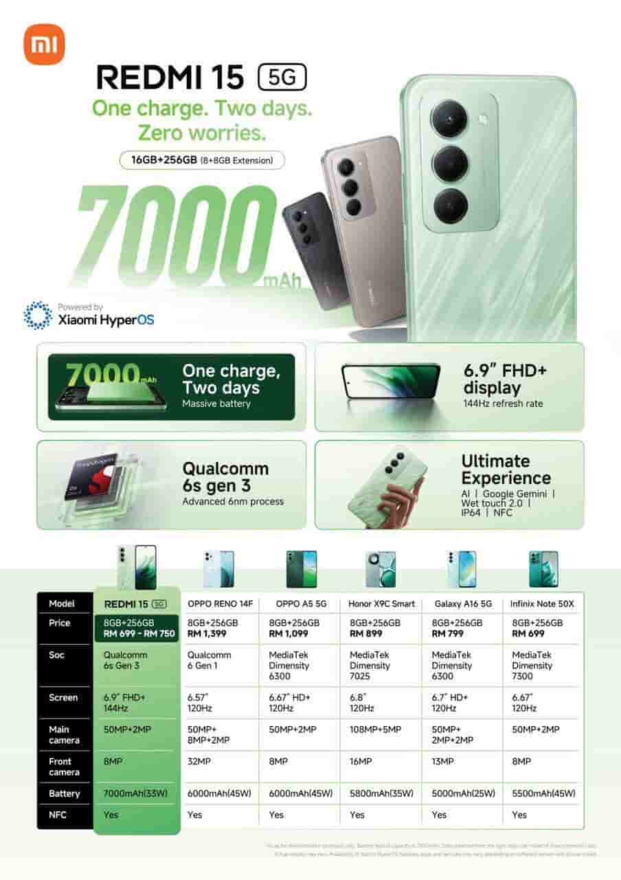 Coming to the specs, Redmi 15 5G features a 6.9-inch display that offers a 144Hz refresh rate. It is powered by Qualcomm Snapdragon 6s Gen 3 SoC paired with up to 16GB RAM (8GB+8GB Extended RAM) and up to 256GB internal storage. It is backed by a 7000 mAh battery and supports 33W fast charging. The device packs a 50MP main camera and a 2MP secondary camera on the rear side, while on the front it features an 8MP selfie camera. It runs on Xiaomi HyperOS.