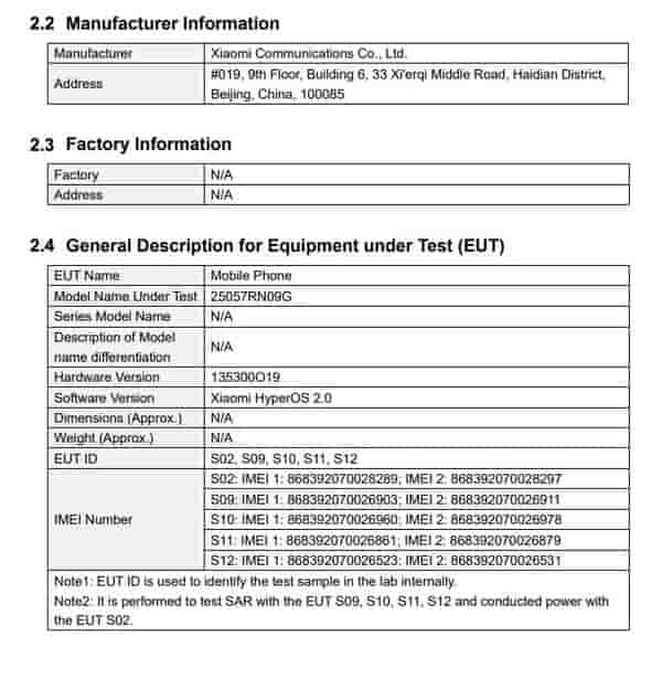 The IMEI database confirms the moniker of the smartphone, while the FCC database confirms some key details about the device. The smartphone will run on Xiaomi HyperOS 2.0. It will support dual SIM with GSM, WCDMA, LTE, and 5G NSA/SA bands. Connectivity options include- WiFi (2.4GHz and 5GHz), Bluetooth (BR+EDR+BLE), NFC, and GNSS. The device supports a wide range of 5G bands, including n1, n3, n5, n7, n8, n20, n28, n38, n41, n66, n77, and n78.