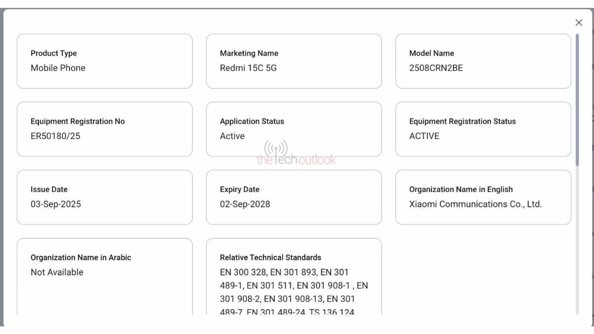 On the TDRA certification database, the Redmi 15C 5G smartphone which carries the model number of ‘2508CRN2BE’ has been listed, and this device has received the TDRA certification with the equipment registration number of ‘ER50180/25’. It has been categorized as a ‘Mobile Phone’, and its certification validity will only be till the 2nd of September 2028.