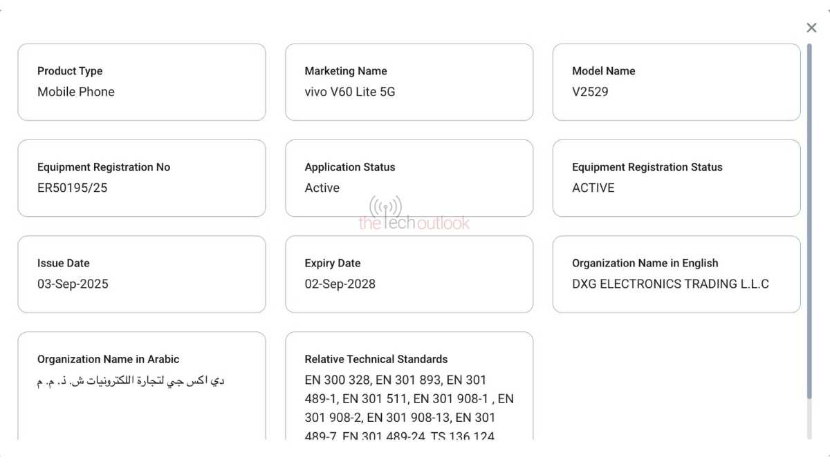 Coming to the Vivo V60 Lite 5G device with the model number of ‘V2529’, the TDRA authority has given the certification with the equipment registration number of ‘ER50195/25’, and the upcoming device has been listed under the ‘Mobile Phone’ category itself. To note, its TDRA certification will also be valid only till the 2nd of September 2028.