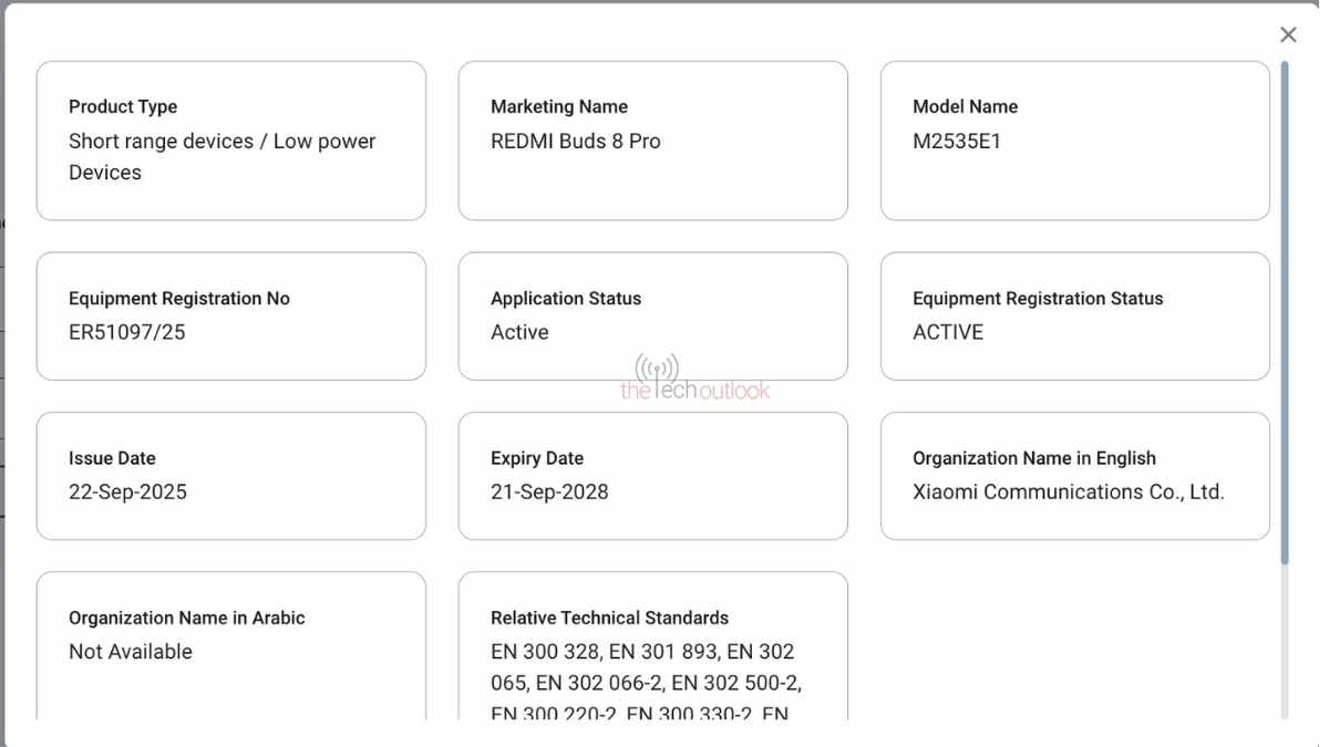 Coming to the TDRA listing, with the same model number of ‘M2535E1’, the Redmi Buds 8 Pro has made its appearance on the TDRA certification database and it has been categorized under the ‘short range devices/low power devices’ section. The upcoming device has received the certification with the equipment registration number of ‘ER51097/25’ and its certification validity is till the 21st of September 2028. Notably, the moniker of the device has also been mentioned on the TDRA certification database.