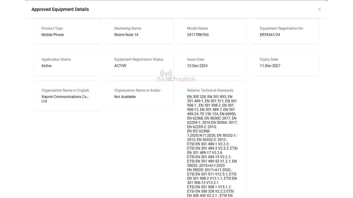 These 4 variants have now been spotted on yet another global certification website. Redmi Note 14 4G (24117RN76G) and Redmi Note 14 Pro 4G (24116RACCG) devices have made their appearance on the TDRA certification website. The database did not reveal much about the devices but it does hint towards its global launch.
