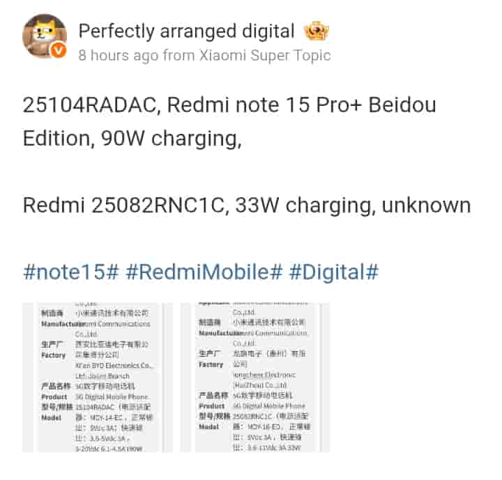 [Update: ‘25082RNC1C’ is the Redmi 15R 5G] Redmi Note 15 Pro+ Beidou Edition and Redmi ‘25082RNC1C’ Wired Fast Charge Support Revealed: To Come With 90W and 33W Charging Capabilities