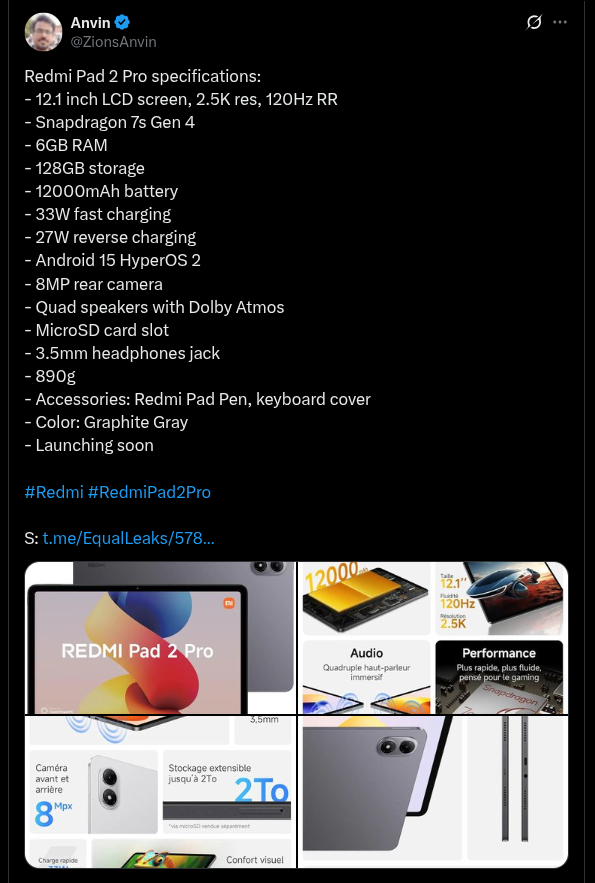 As per the details that have now been revealed, the Redmi Pad 2 Pro tablet will be powered by the Qualcomm Snapdragon 7s Gen 4 processor and it will be featuring an LCD display with 12.1″ screen size, 2.5K resolution, and 120Hz refresh rate. The device is also suggested to be coupled with 6GB of RAM and 128GB of internal storage, and it will be running on the Android 15-based HyperOS 2 custom skin. An 8MP rear camera will also be offered, and the device will be packing a 12000 mAh battery that supports 33W wired + 27W reverse wired charging.