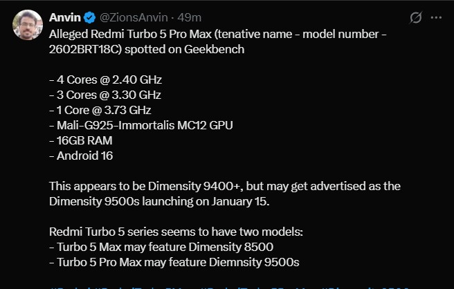 Adding to the confusion, tipster Anvin has suggested that the lineup could instead include a Max and a Pro Max variant. If true, this would indicate that Redmi may be adopting a new branding strategy for the Turbo series.