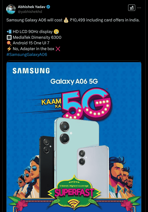 Just to add, according to previous updates, Samsung would be offering its Galaxy A06 5G model in 4GB/64GB, 4GB/128GB, and 6GB/128GB storage configurations for Indian customers, and their respective list prices were revealed to be INR 12,499, INR 13,999, and INR 15,999.