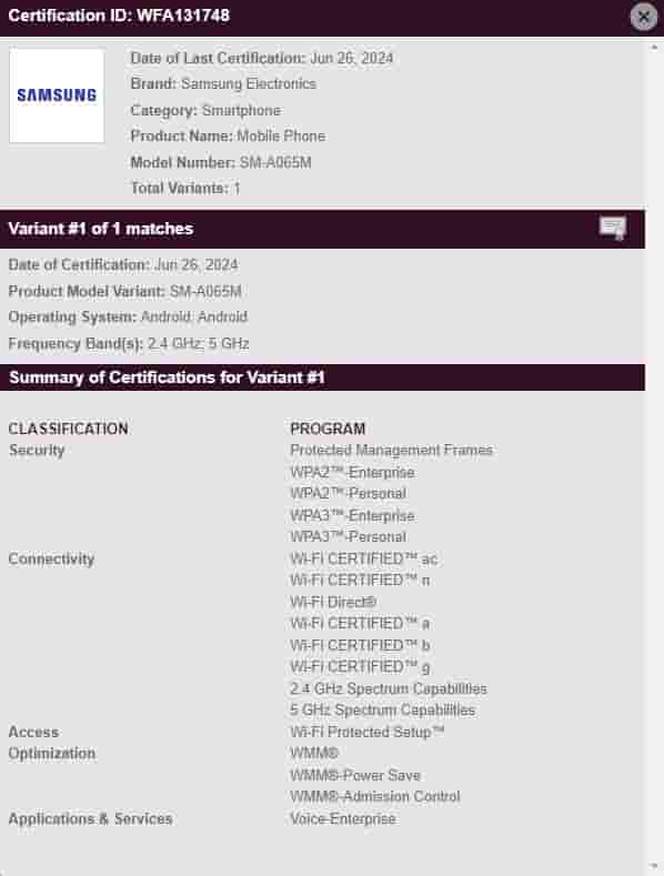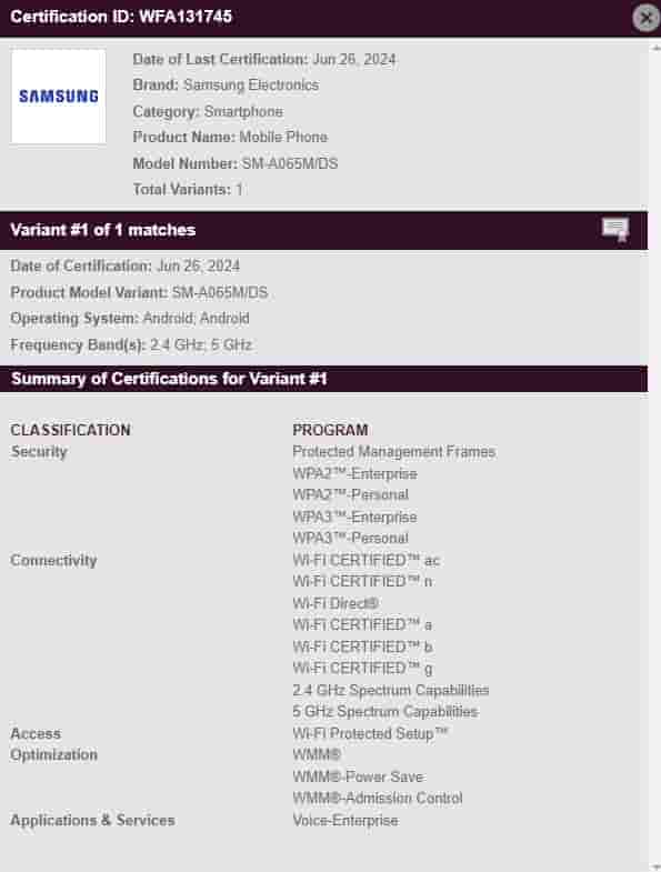 Model numbers SM-A065M and SM-A065M/DS have also made their appearance on the Wi-Fi Alliance certification website which suggests that the upcoming smartphone will be arriving with support for dual-band Wi-Fi 5.