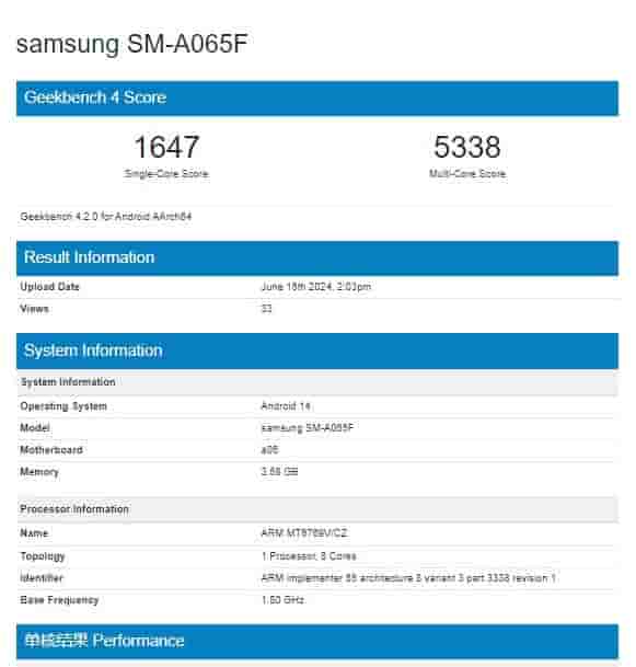 The Geekbench listing reveals that the smartphone has received 1647 single-core score and 5338 multi-core score. It suggests that the device will be powered by MediaTek Helio G85 processor, the same chipset that powered Galaxy A05. It will run on Android 14 OS and offer 4GB RAM. While the BIS listing did not reveal the moniker of the device, recently this same model number was spotted on the IMEI database which revealed that the moniker of the device is Galaxy A06. Well, BIS listing now confirms that Galaxy A06 will soon be launching in India.