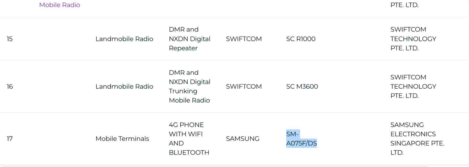 Samsung Galaxy A07 4G has been spotted on the IMDA database with model number SM-A075F/DS. The database reveals that the 4G device will arrive with WiFi and Bluetooth connectivity.