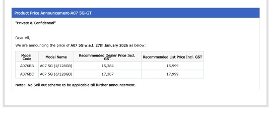 In a post on X, tipster Abhishek Yadav revealed that the Galaxy A07 5G’s 4GB RAM + 128GB storage variant could be priced at around Rs 15,999, while the 6GB + 128GB variant may cost around Rs 17,999. These prices appear to be for the offline market, which also suggests that the device may already be available through offline retail channels. However, the smartphone is not yet listed on any online platform, and an official online announcement is likely to happen soon.