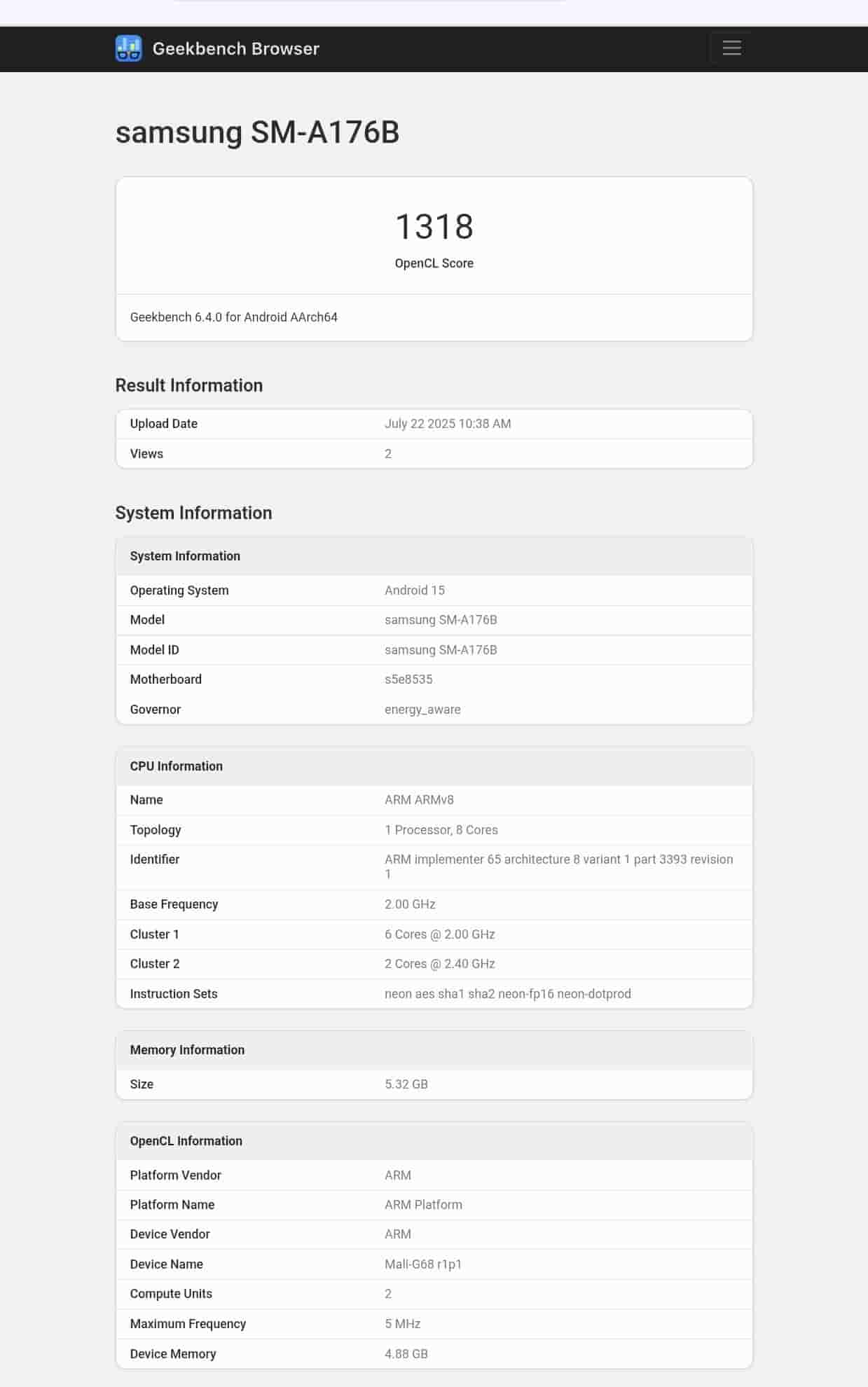 Samsung’s Galaxy A17 5G smartphone model carrying the model number of ‘SM-A176B’ (India, International 5G) has been listed on the Geekbench database, and the device has achieved a single-core performance score of 942 points and multi-core performance score of 2137 points. In terms of its GPU performance, the Galaxy A17 5G was able to attain 1318 points on the OpenCL test.