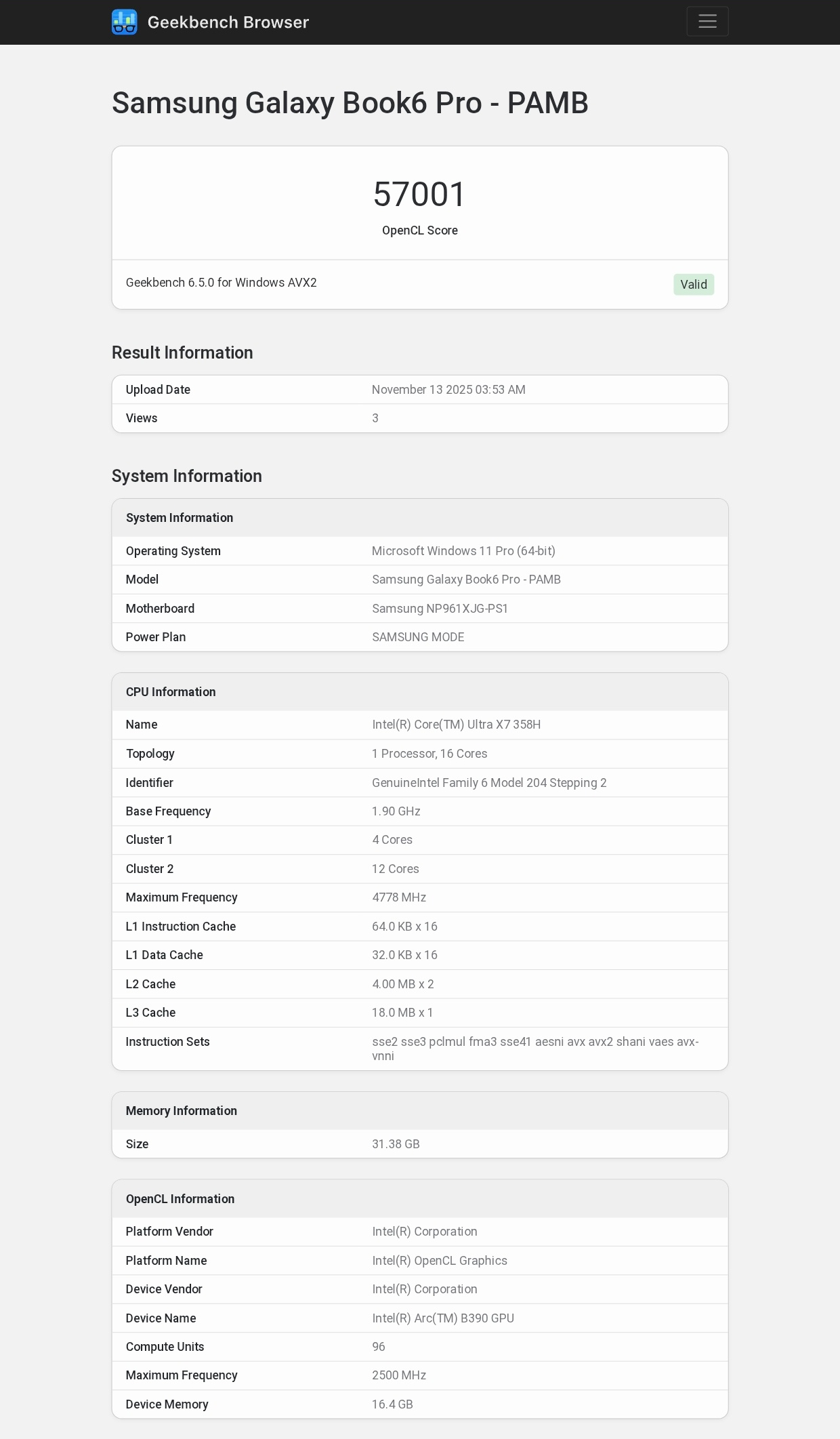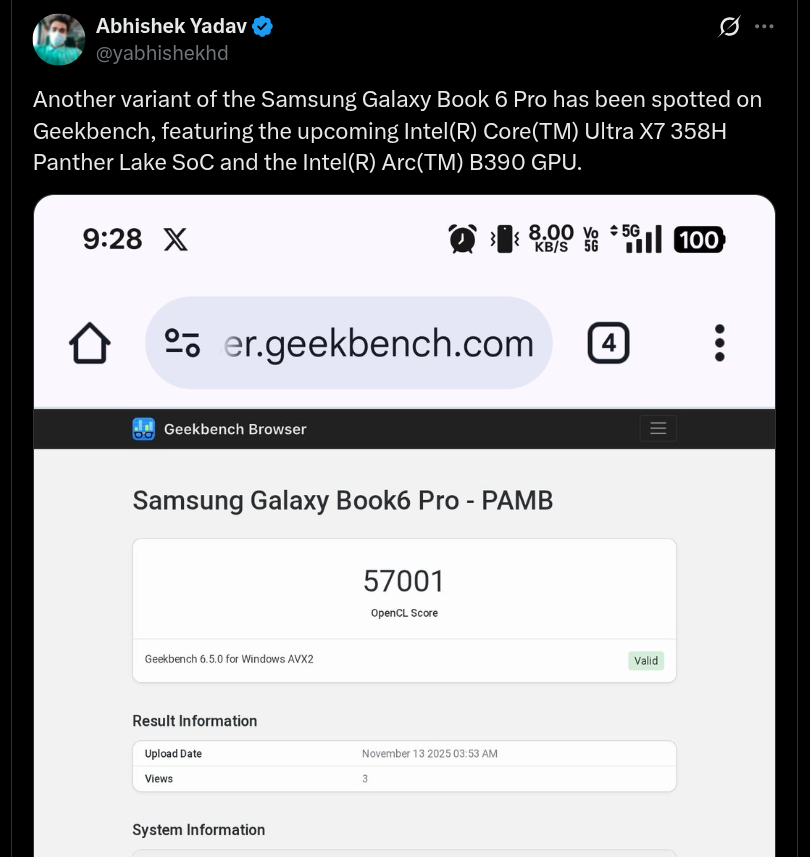 On the Geekbench database, Samsung’s Galaxy Book 6 Pro laptop which carries the codename – ‘PAMB’ has acquired a GPU benchmark score of 57001 points in the OpenCL test. This variant is mentioned to feature the Intel Core Ultra X7 358H Panther Lake chip (upcoming) and the Intel Arc B390 GPU (16GB, 2500 MHz, 96 compute units), and its motherboard codename is revealed to be ‘Samsung NP961XJG-PS1’. Microsoft’s Windows 11 Pro (64-bit) operating system will be running on it, and it is its 32GB RAM model that has been listed on the Geekbench database.