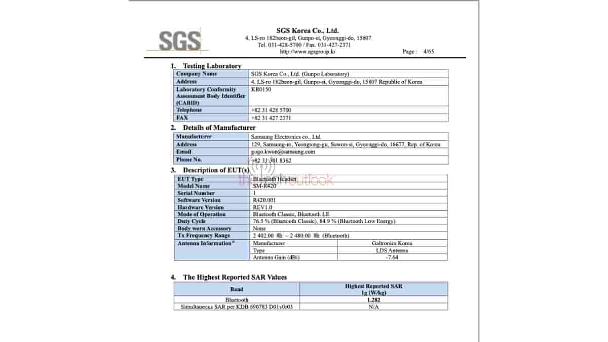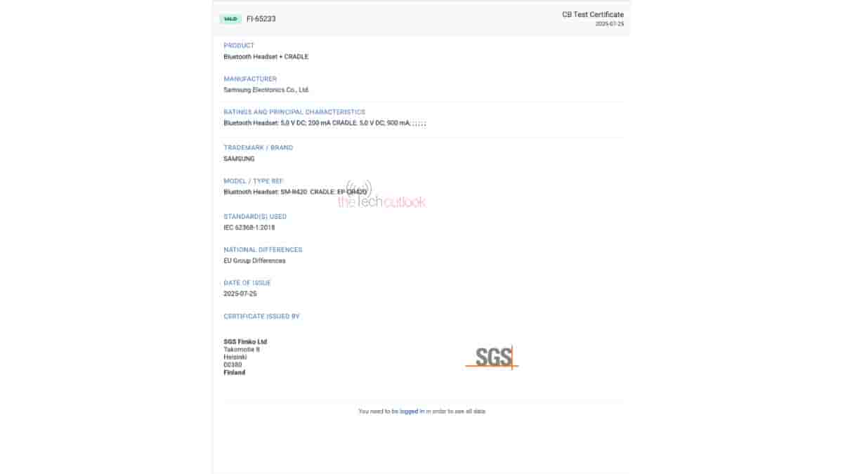 Coming to its SGS Fimko certification listing, both the earbuds (‘SM-R420’) and the charging cradle (‘EP-QR420’) have received the certification with the certificate number of ‘FI-65233’. Moreover, the certification database points out that each of the earbuds will pack a 200 mAh battery, whereas the charging cradle will be equipped with a 900 mAh battery.