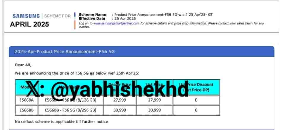 The company has not yet announced the launch date, but the device is expected to debut soon. Ahead of its upcoming launch, tipster @yabhishekhd has exclusively shared the pricing details of the Galaxy F56 5G Indian variant.