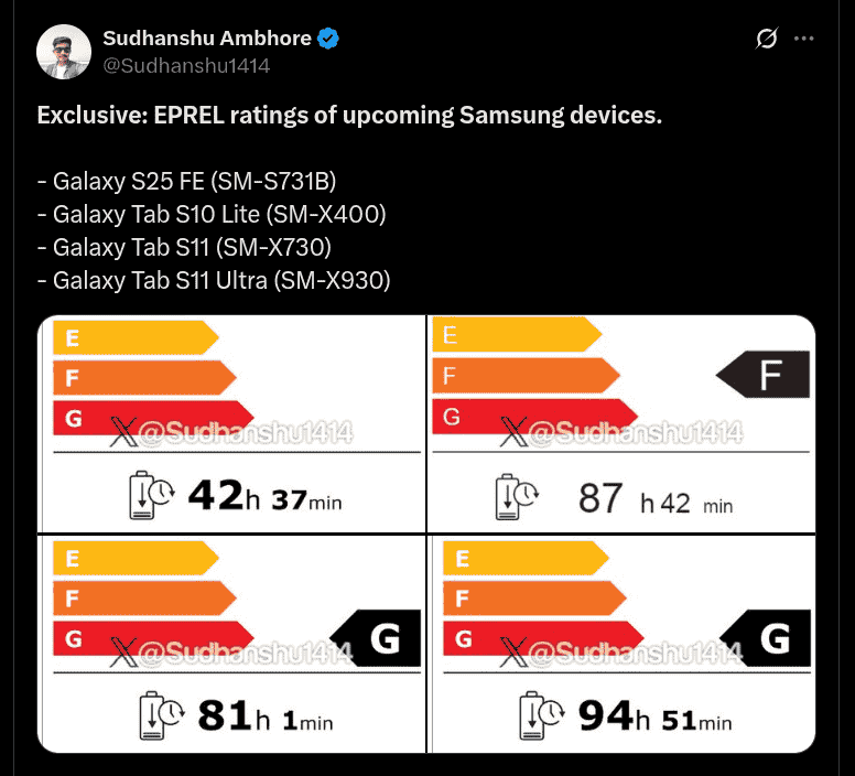 Galaxy S25 FE, Galaxy Tab S10 Lite, Galaxy Tab S11, and Galaxy Tab S11 Ultra – Revealed EPREL Ratings
