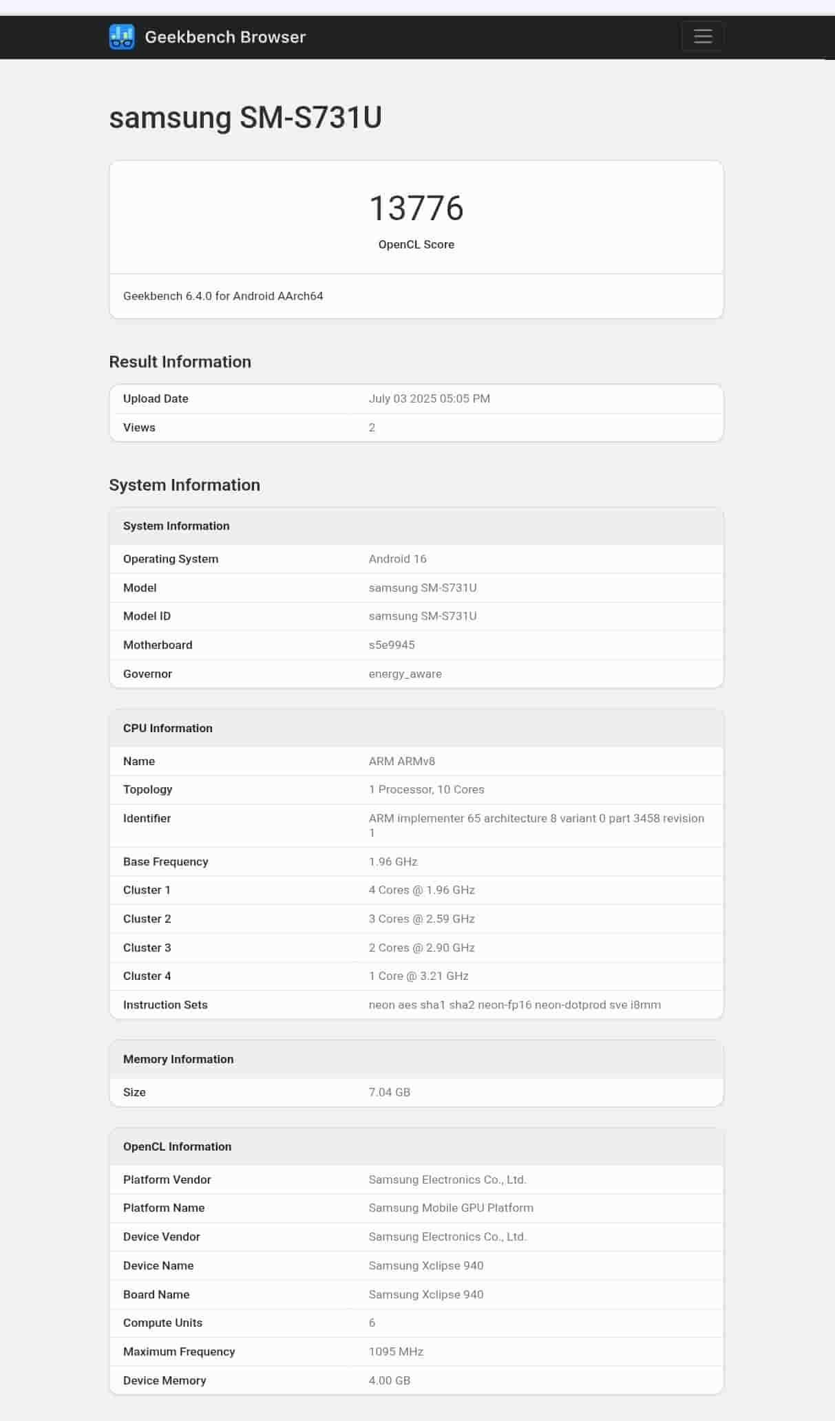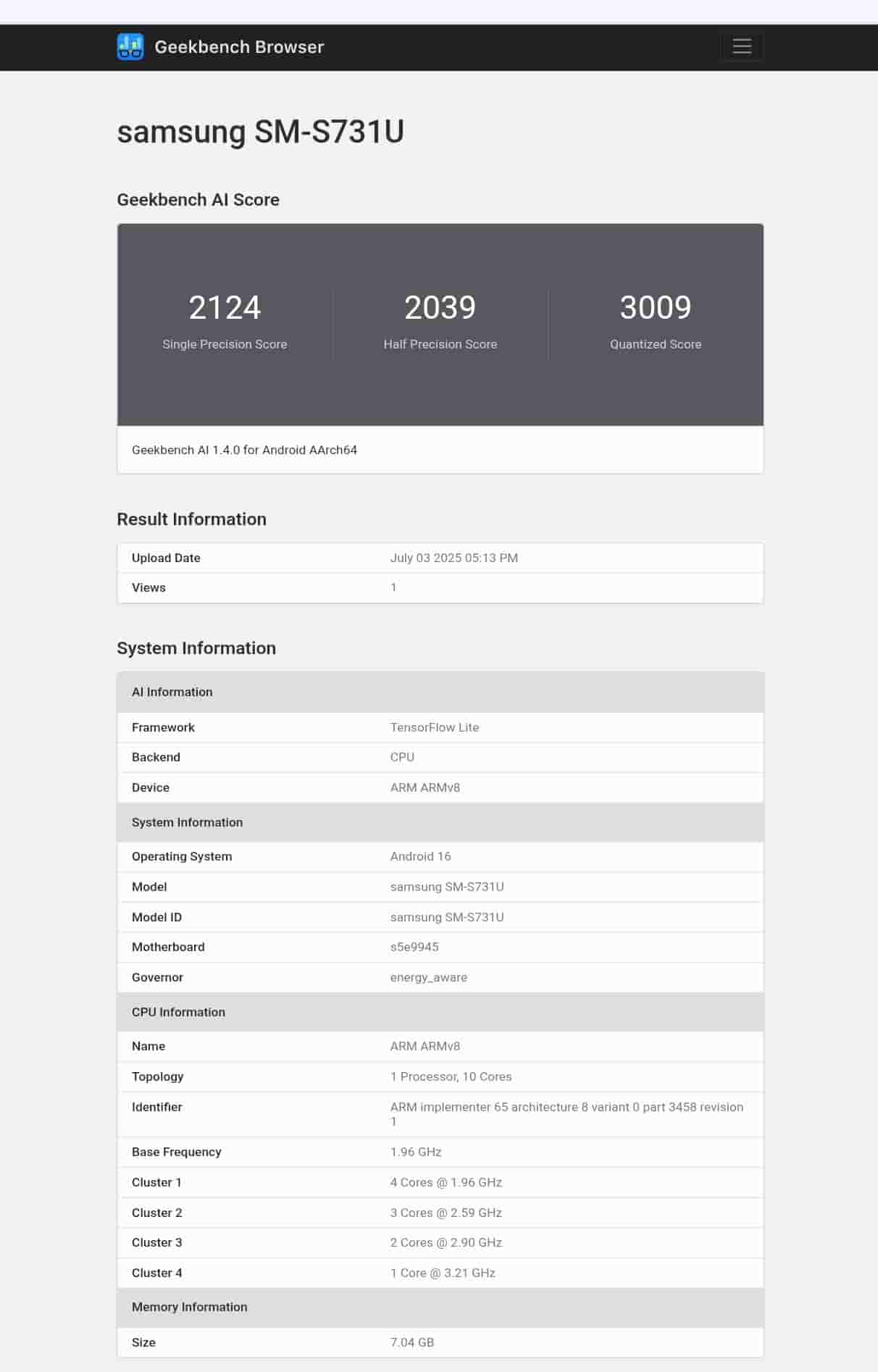 Samsung’s Galaxy S25 FE smartphone model with the model number of ‘SM-S731U’ was previously spotted on the Geekbench database and now, its GPU and AI performance scores have also been revealed. About its GPU performance, the device has acquired 13776 points on the Geekbench OpenCL test. Regarding the Geekbench AI scores, it attained 2124 points single precision score, 2039 points half precision score, and 3009 points quantized score. Moreover, its specifications such as the Exynos 2400 chipset, Xclipse 940 GPU, Android 16 operating system, and an 8GB RAM option have again been mentioned via the new listings.