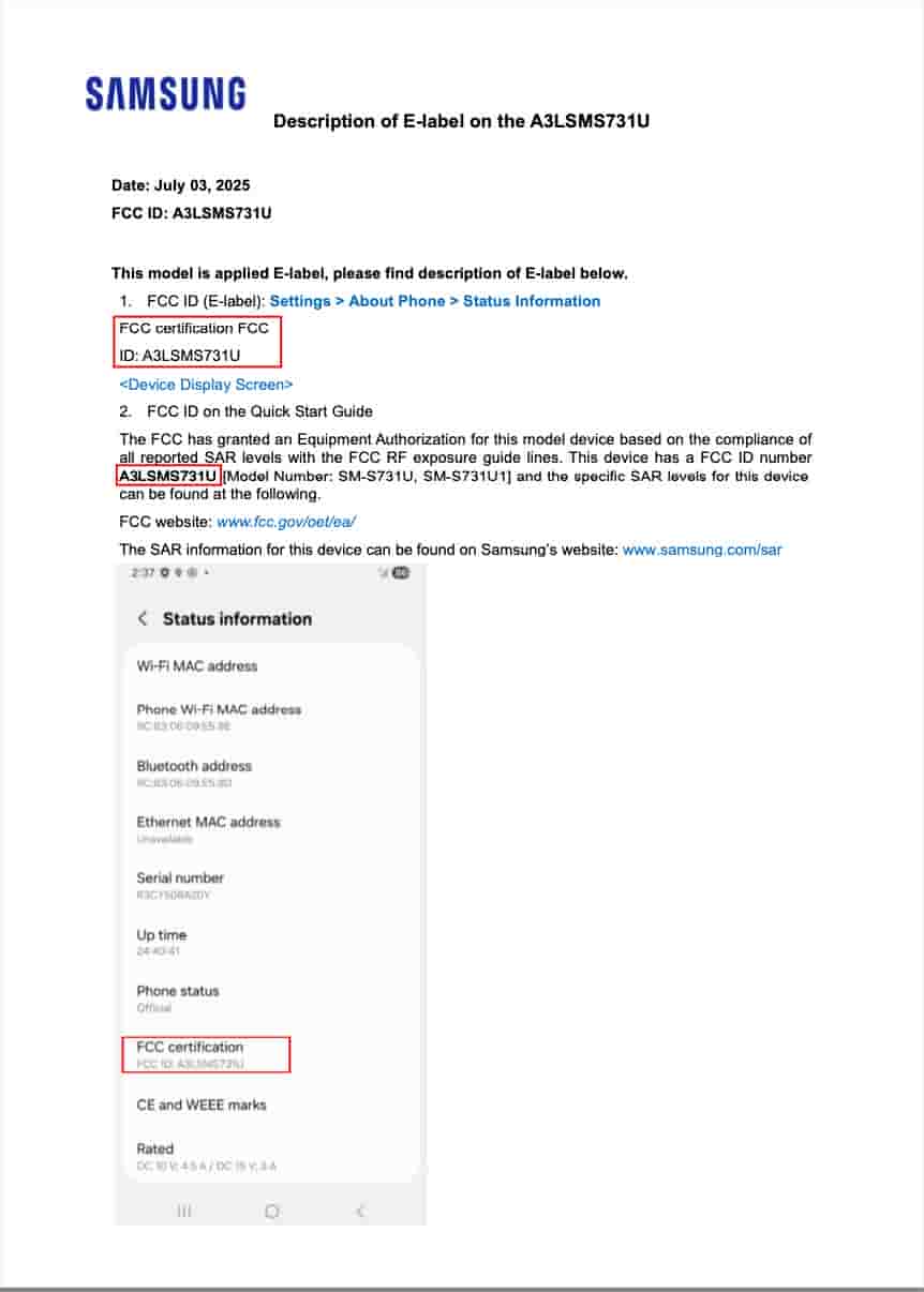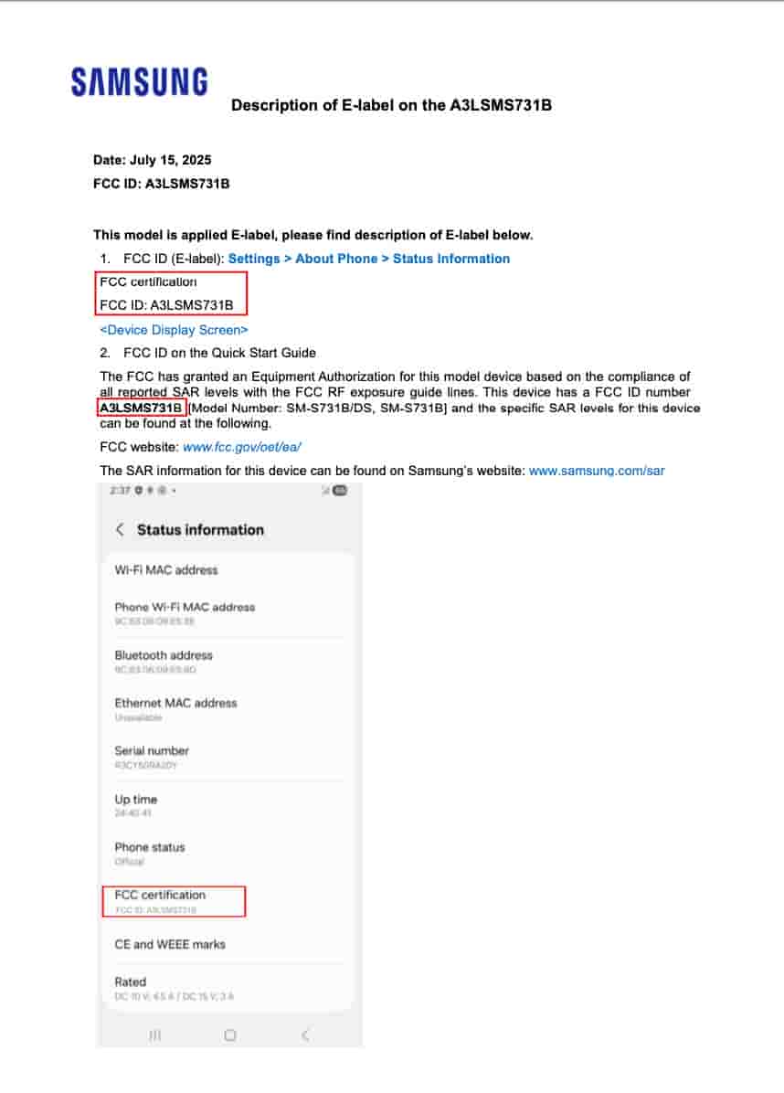 The US variants of Samsung’s Galaxy S25 FE smartphone that carry the model number of ‘SM-S731U‘ and ‘SM-S731U1’ have received the FCC certification with the FCC ID of ‘A3LSMS731U’. Via the certification, specifications like 2G/3G/4G/5G network, WiFi (with triple band support), Bluetooth (LE), NFC, HAC (hearing aid compatibility) mode, wireless charging, and 45W wired charging have been revealed.