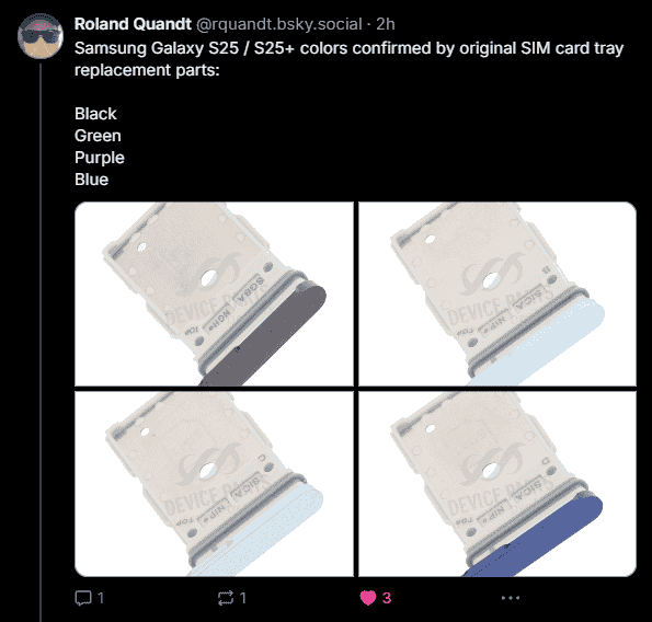 Today tipster Roland Quandt shared the color options (received via @theonecid) of Galaxy S25/S25+ that are confirmed by original SIM card tray replacement parts.