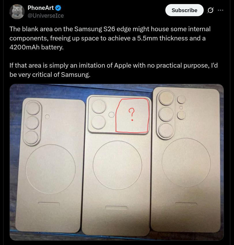 Regarding the Galaxy S26 Edge, a rectangular-like horizontally-placed camera module is given at the top of the rear panel according to the revealed dummy unit, and this is entirely different from that of its predecessor. At the left of the camera module, three circular units have been arranged in a triangular pattern, while the right side remains vacant. Likely two of the internal circular units could be housing camera sensors and the last one may have the LED flashlight equipped within it. Reportedly, it is also suggested that the right portion of the camera module may have some internal components to free up space for the 4200 mAh battery and provide a 5.5 mm slimmer thickness.