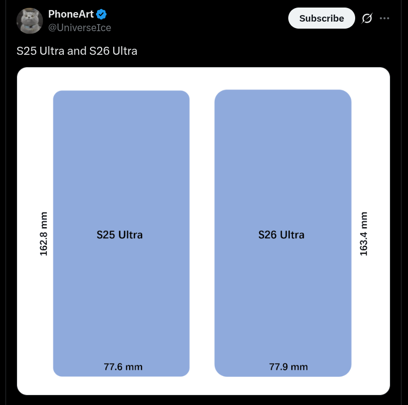 Speaking more, the dummy units reveal a pill-shaped vertically-placed projected camera module for both the Galaxy S26 Pro and the Galaxy S26 Ultra at the top-left portion, and it will probably be housing three camera sensors while the LED flashlight could be positioned outside of it at the right. Additionally, along with the LED flashlight, the Galaxy S26 Ultra just like its predecessor may be occupying two external circular units as well, of which one will have a camera unit whereas the other likely equips an added sensor. To note, in comparison with the Galaxy S25 Ultra, its successor is tipped to be longer and wider with a length of 163.4 mm (from 162.8 mm) and width of 77.9 mm (from 77.6 mm).