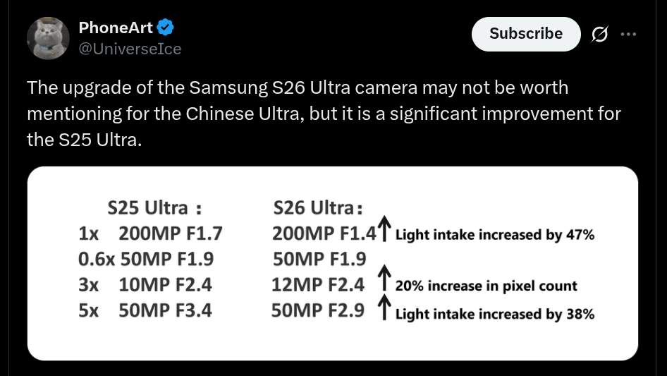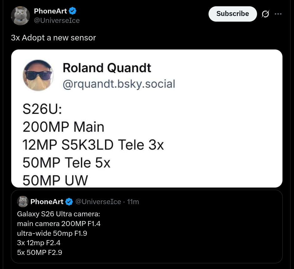 The upcoming Samsung Galaxy S26 Ultra as per the new update received via the tipster @UniverseIce, is again revealed to sport a quad rear camera system featuring a 200MP main camera, new 12MP telephoto camera with 3x zoom capability (S5K3LD sensor), 50MP telephoto camera with 5x zoom capability, and a 50MP ultra-wide camera. Previously, the same tipster had also tipped that the device will be equipped with the ISOCELL HP2 camera sensor supporting f/1.4 large aperture. An earlier update had also suggested an under-display selfie camera too for the flagship device.