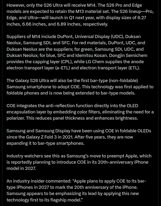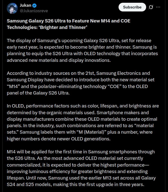 The new material set ‘M14’ is considered to be the most advanced OLED material set, and it is said to be used first time by Samsung via its Galaxy S26 Ultra flagship, while the Galaxy S26 Pro and the Galaxy S26 Edge would continue using the same M13 material set. With the M14 set, the luminous efficiency of the Galaxy S26 Ultra smartphone will be improved, as well as its lifespan. The same source also notes that the Galaxy S26 Ultra, Galaxy S26 Pro, and the Galaxy S26 Edge that are coming out early next year (probably in February 2026) would respectively feature display screen sizes of 6.89″, 6.27″, and 6.66″.
